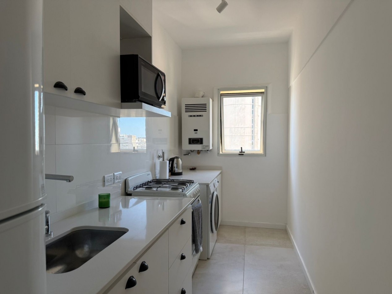 • Cocina separada, totalmente equipada con línea blanca (heladera, microondas, lavarropas, cocina, vajilla completa).