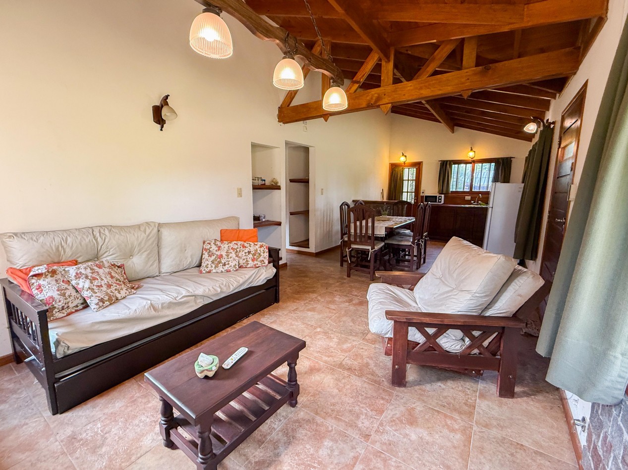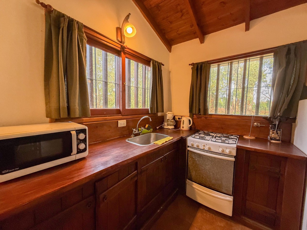 La cabaña cuenta con living comedor con cocina integrada, dos dormitorios y baño completo. En el exterior dispone de galería con parrilla, parque y espacio de trotadora para vehículos.