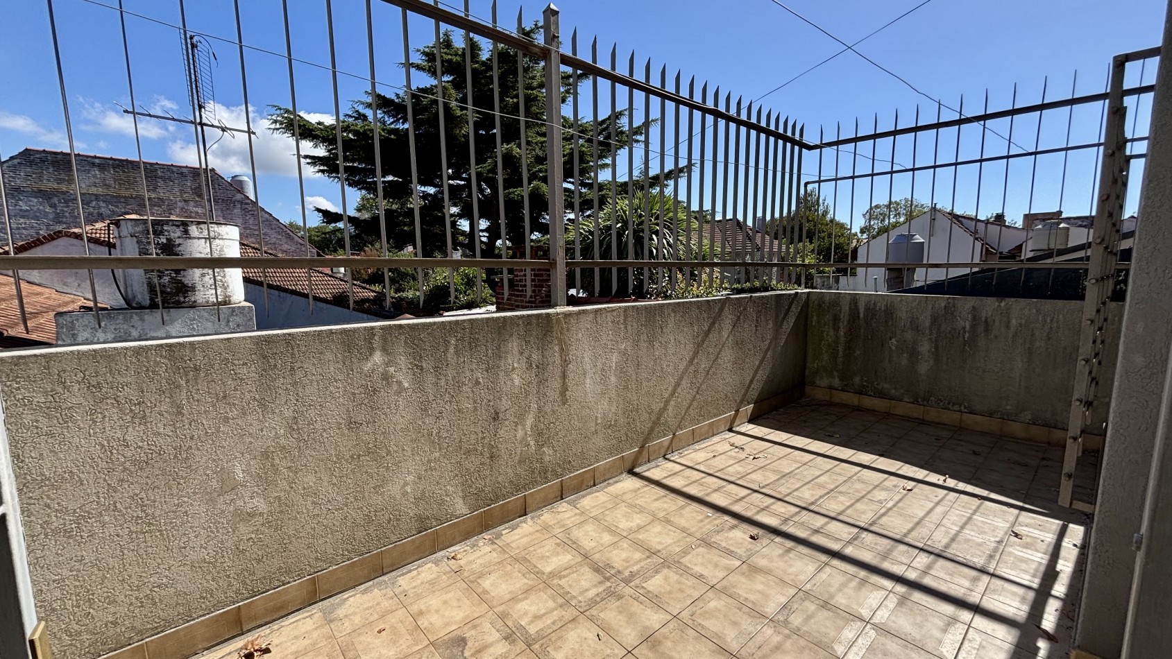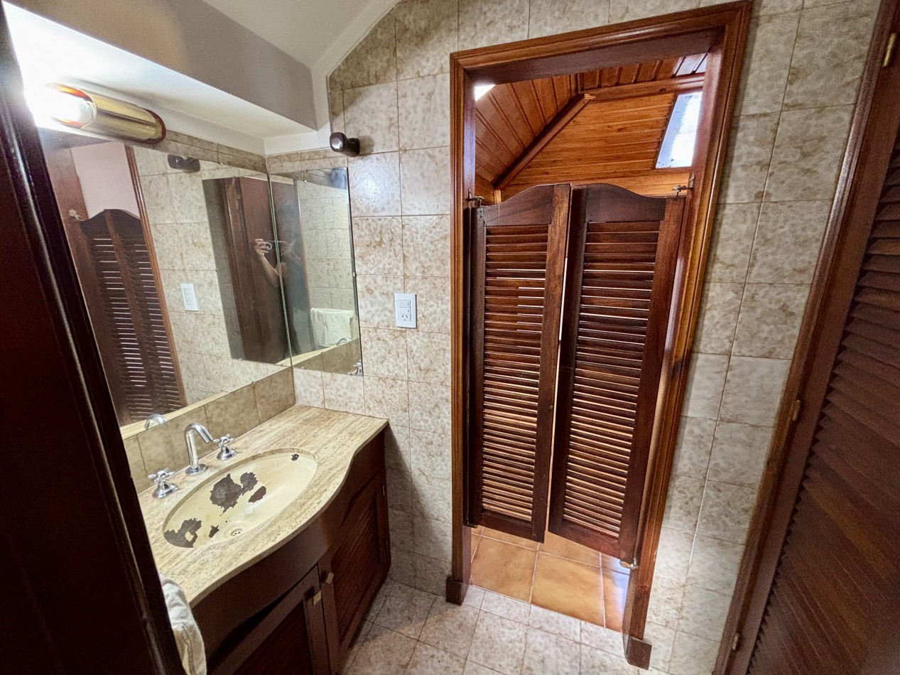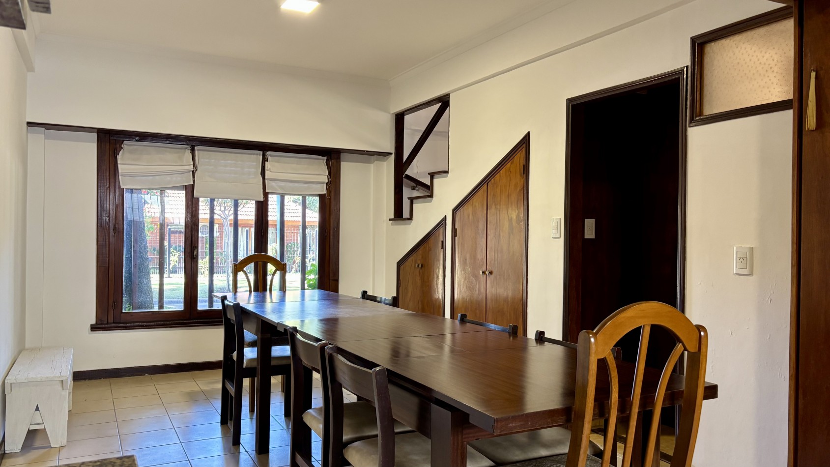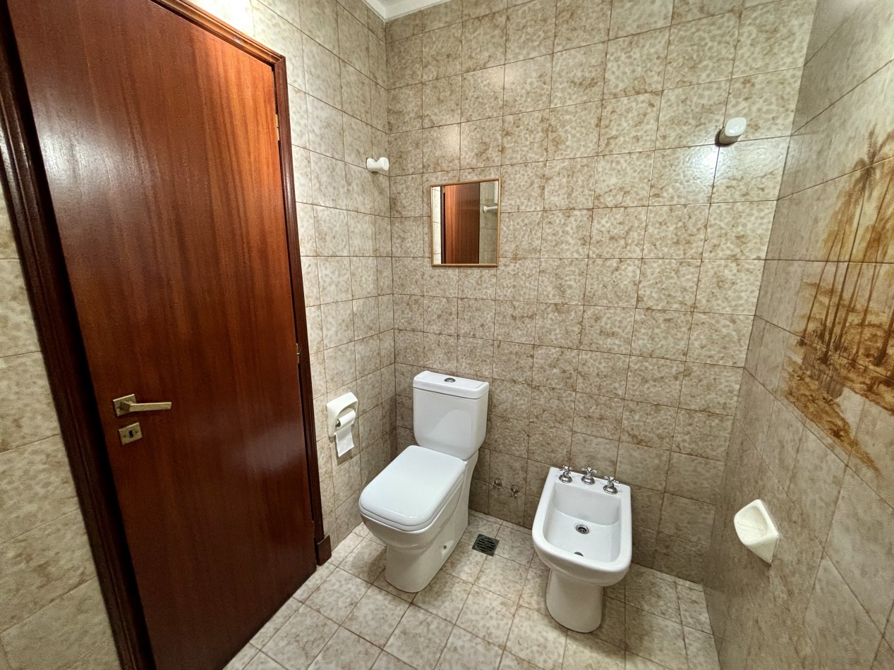 Casa de dos plantas en Parque Luro con 217 m² totales y tres espacios al aire libre independientes: garaje cubierto de gran porte con parrilla incorporada (adaptable a quincho), terraza en planta alta y patio interior privado con espacio para vehículo adicional o guardado.
