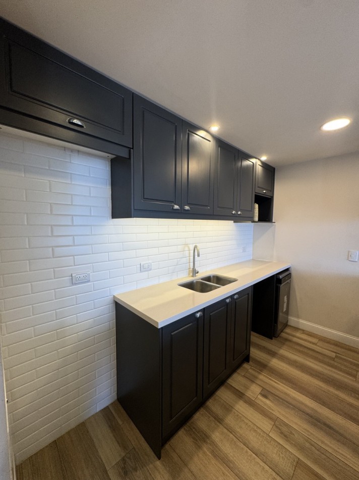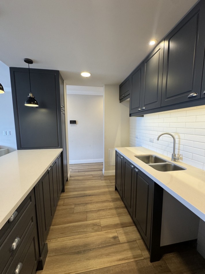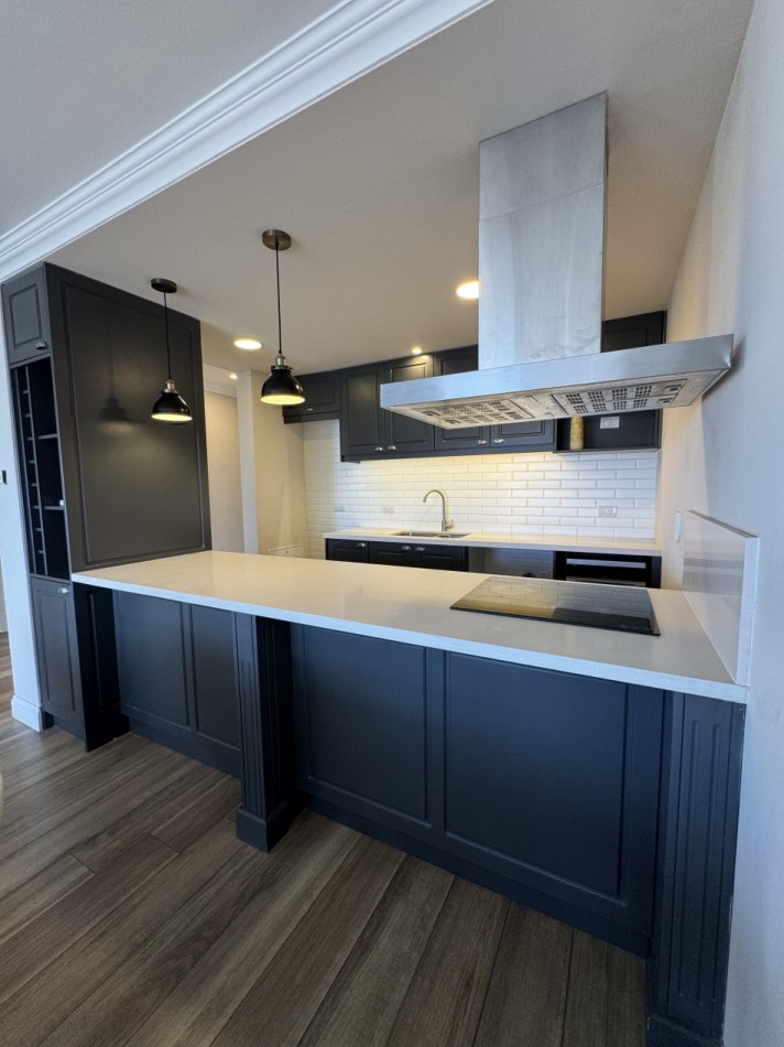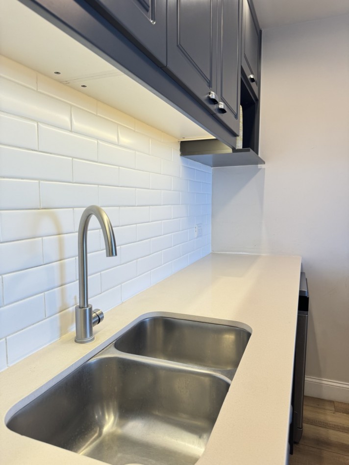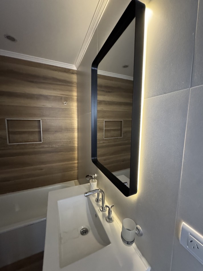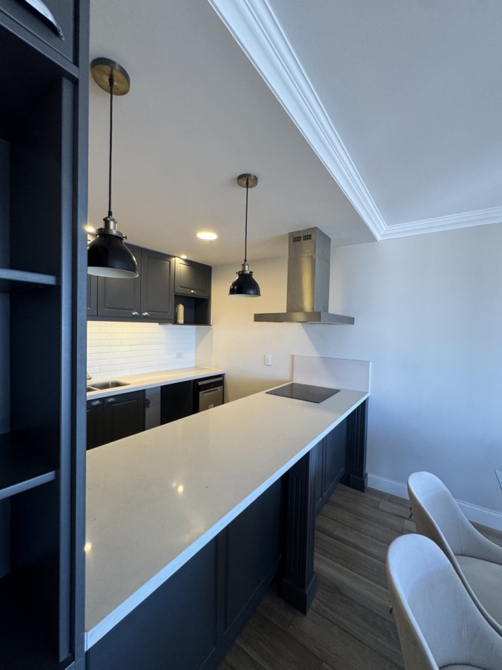 • Mesada de cuarzo con bacha Johnson ovalada y grifería importada en negro mate.