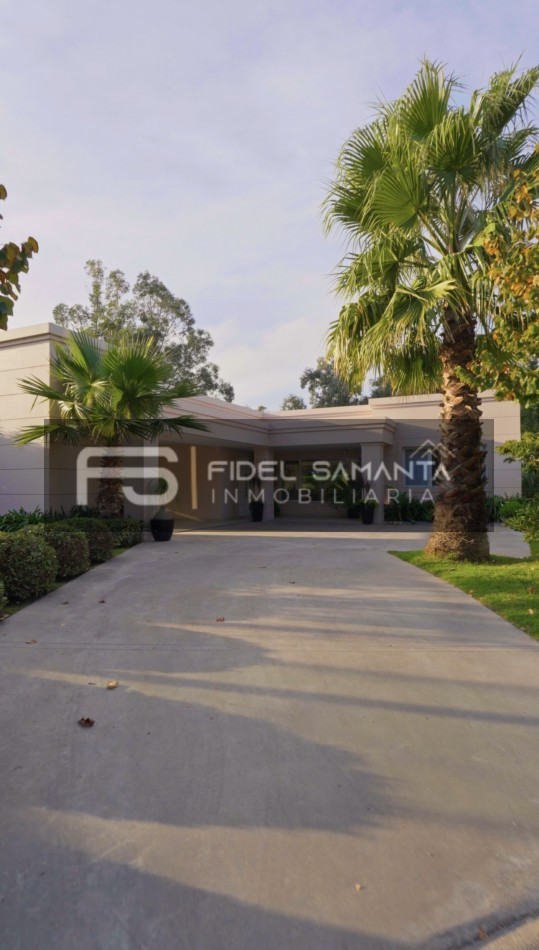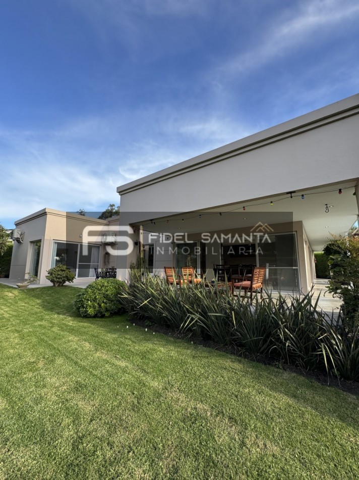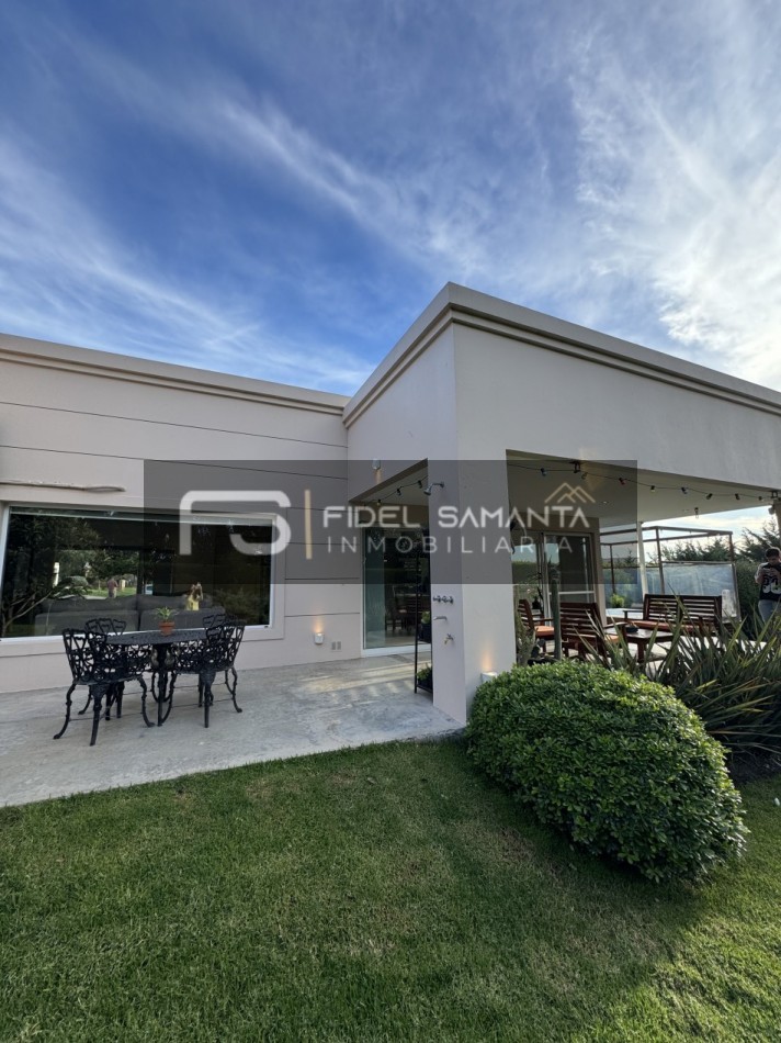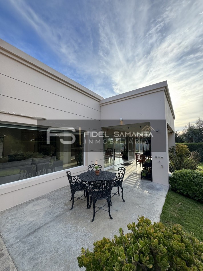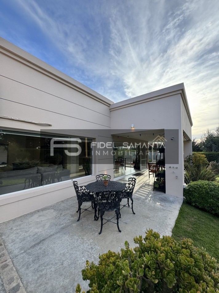 Exclusiva propiedad de estilo moderno desarrollada íntegramente en planta baja, ubicada en el barrio privado Arenas del Sur.