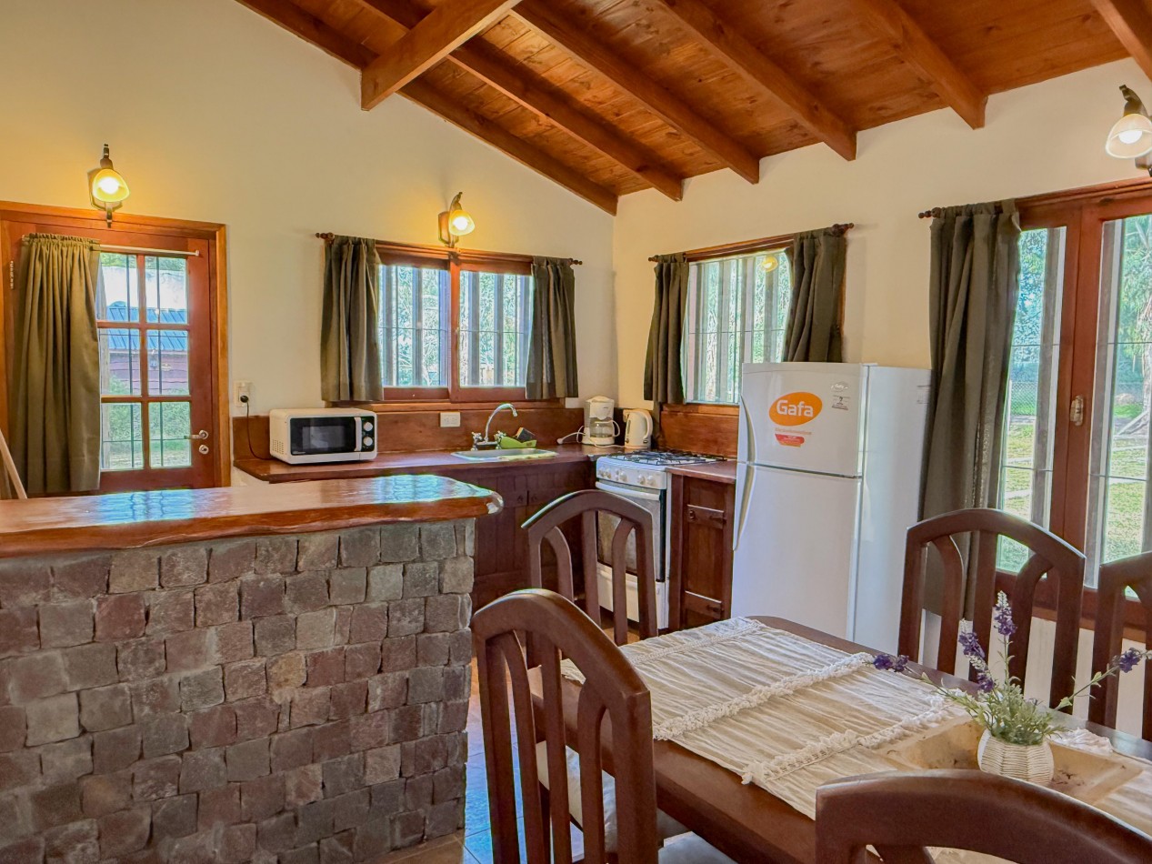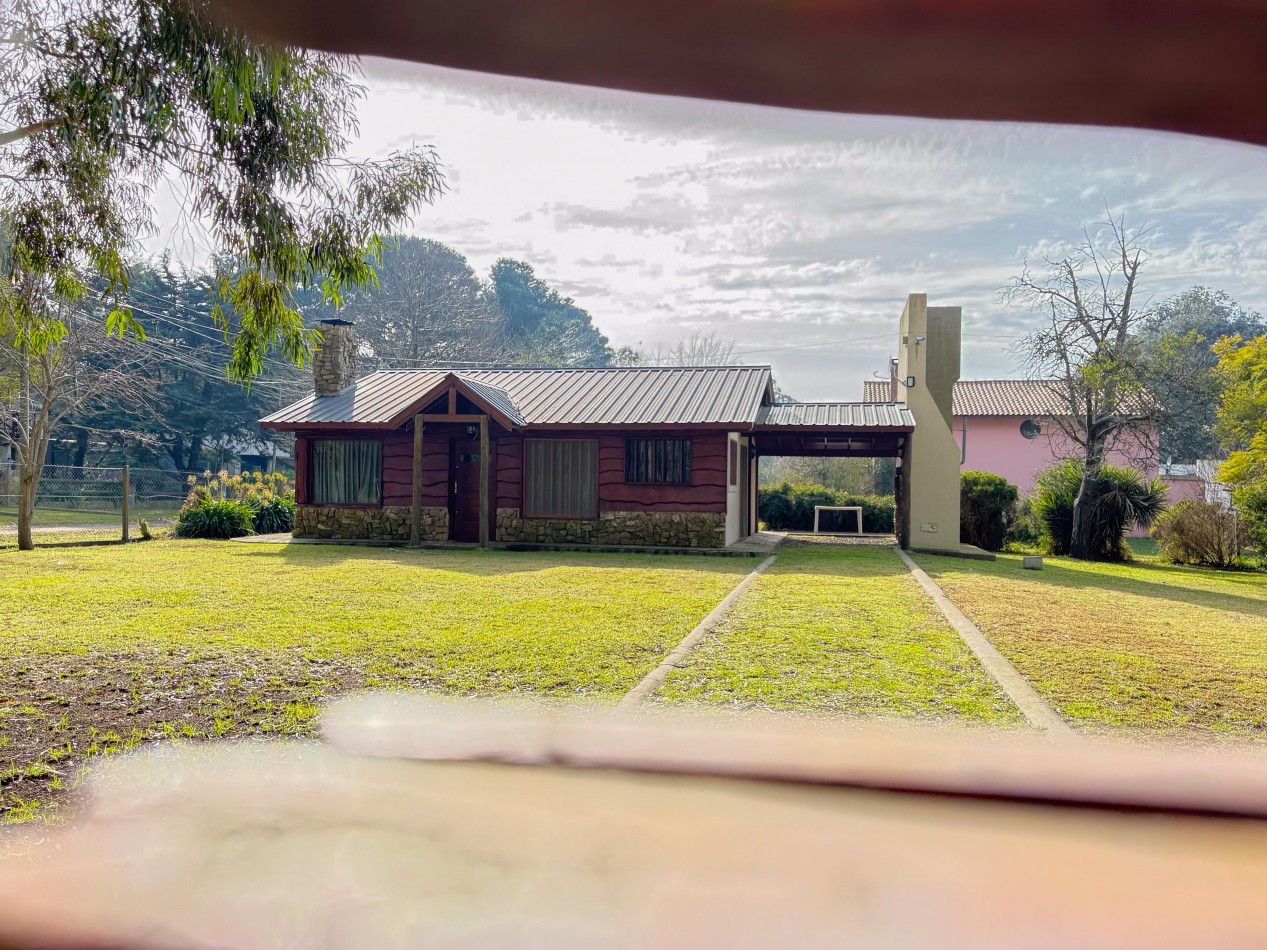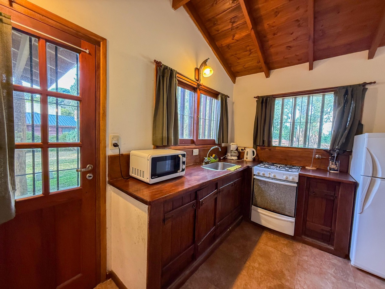 La cabaña cuenta con living comedor con cocina integrada, dos dormitorios y baño completo. En el exterior dispone de galería con parrilla, parque y espacio de trotadora para vehículos.