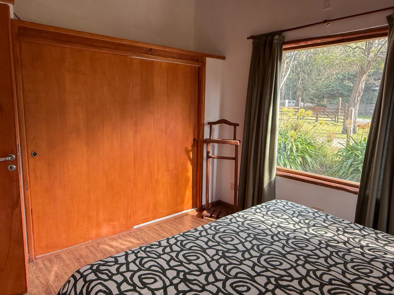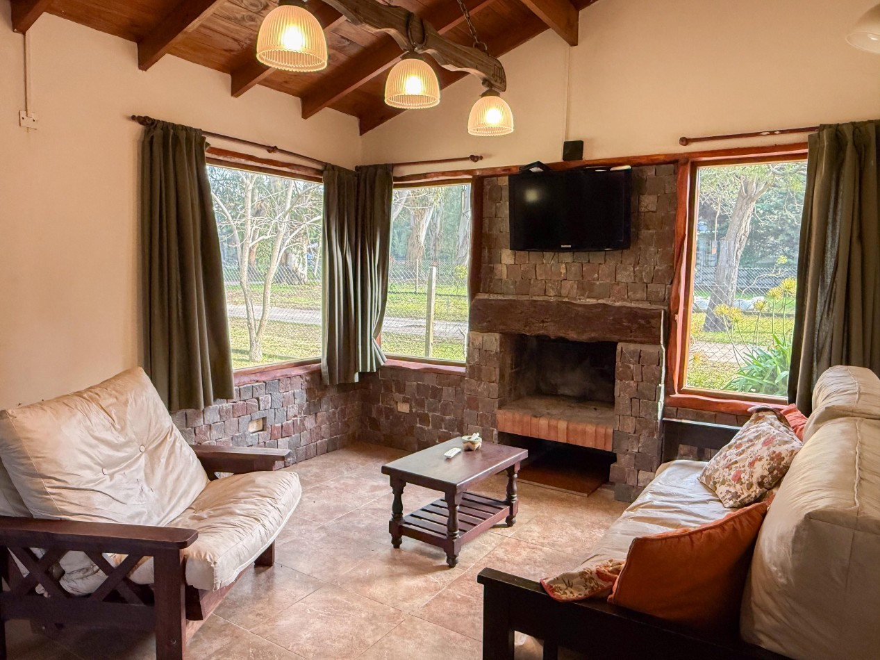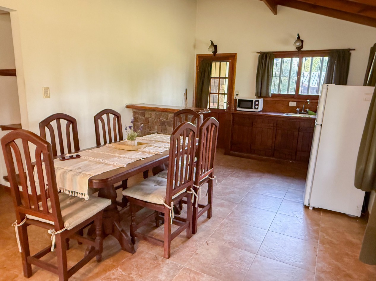 La cabaña cuenta con living comedor con cocina integrada, dos dormitorios y baño completo. En el exterior dispone de galería con parrilla, parque y espacio de trotadora para vehículos.