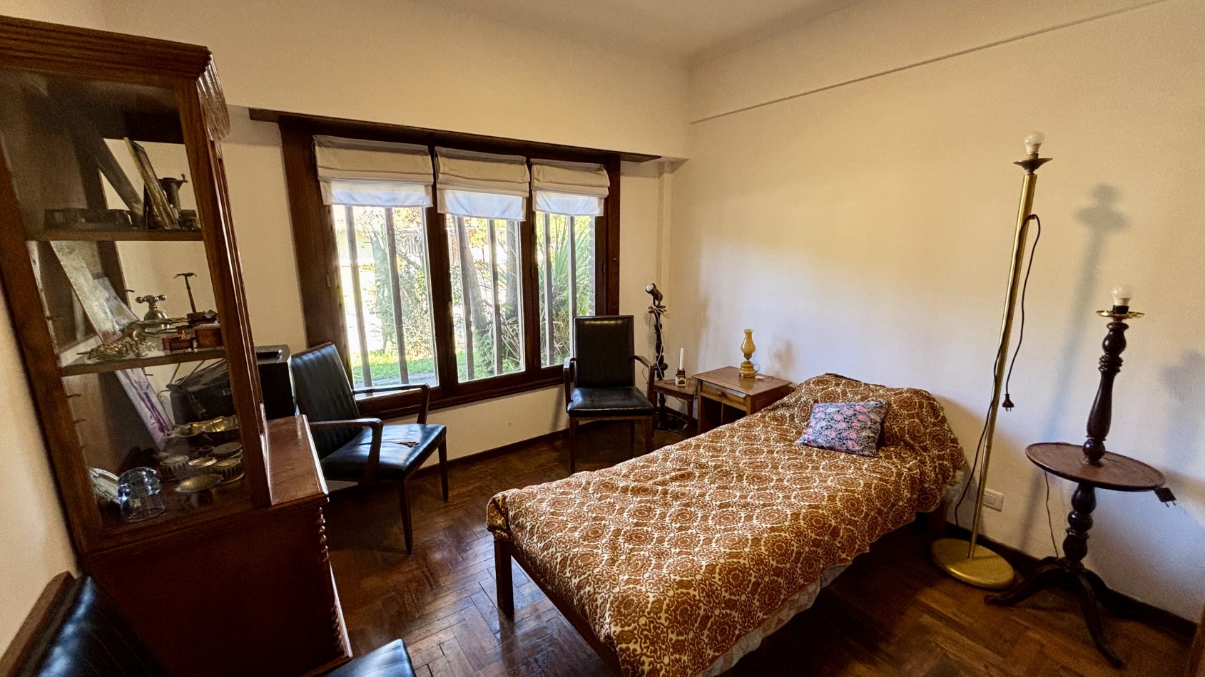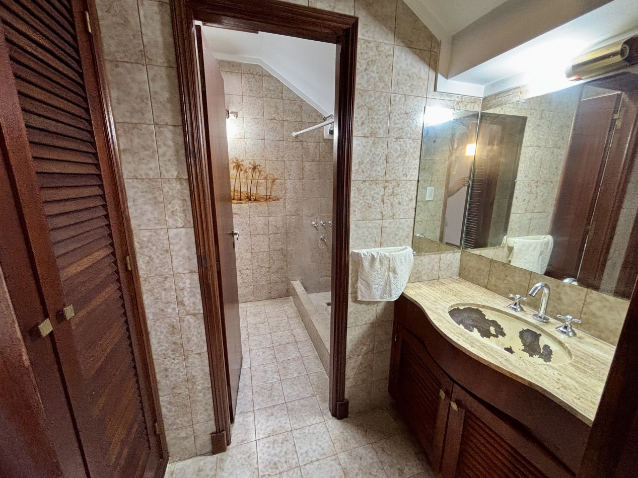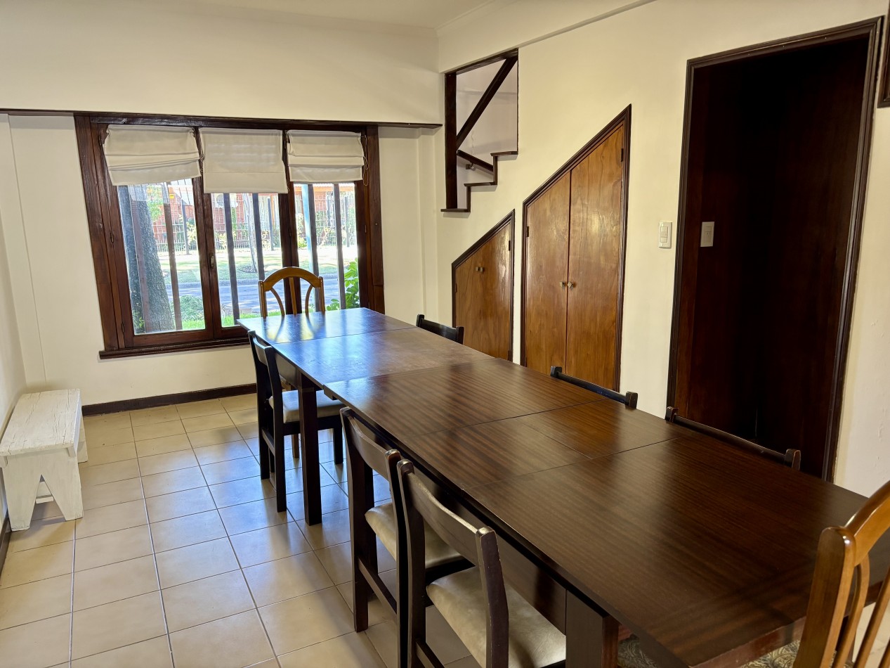 Casa de dos plantas en Parque Luro con 217 m² totales y tres espacios al aire libre independientes: garaje cubierto de gran porte con parrilla incorporada (adaptable a quincho), terraza en planta alta y patio interior privado con espacio para vehículo adicional o guardado.