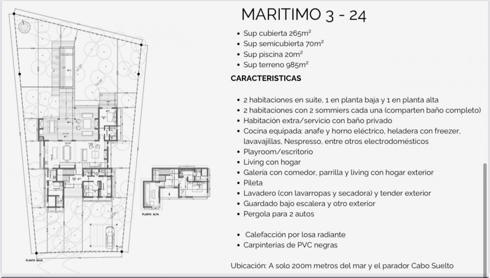 Desarrollada sobre un terreno de 985 m², la propiedad cuenta con 265 m² cubiertos y 70 m² semicubiertos, donde cada espacio fue diseñado para ofrecer amplitud, luminosidad y confort. Los techos altos, las grandes aberturas y la selección de materiales generan una atmósfera cálida y sofisticada que conecta permanentemente interior y exterior.
