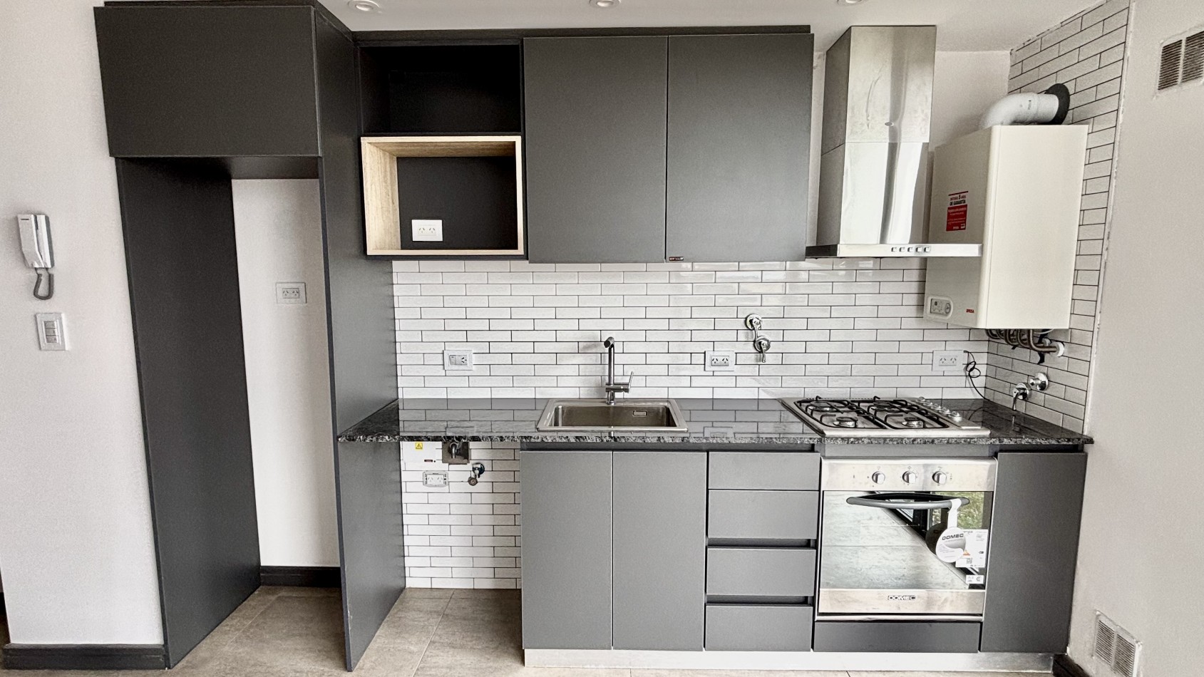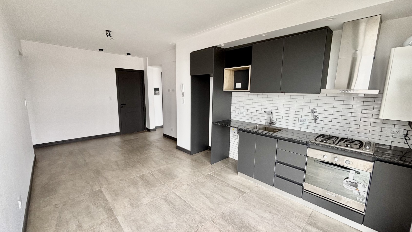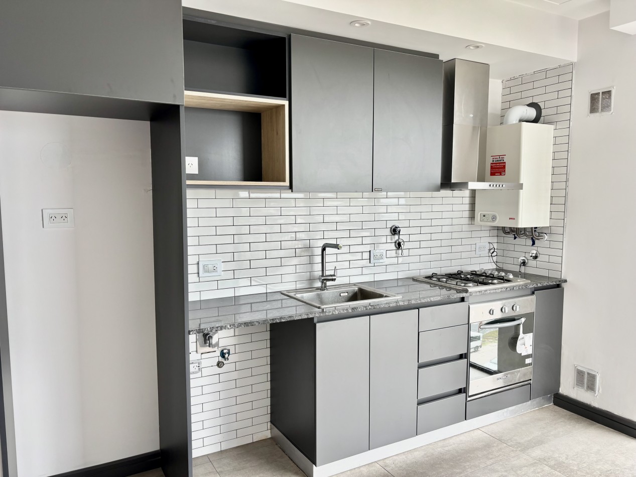 La unidad cuenta con aproximadamente 70 m² totales, ofreciendo un amplio living comedor con salida a balcón, lo que garantiza luminosidad natural durante todo el día. La cocina se integra al ambiente principal con mobiliario a medida y excelente funcionalidad.